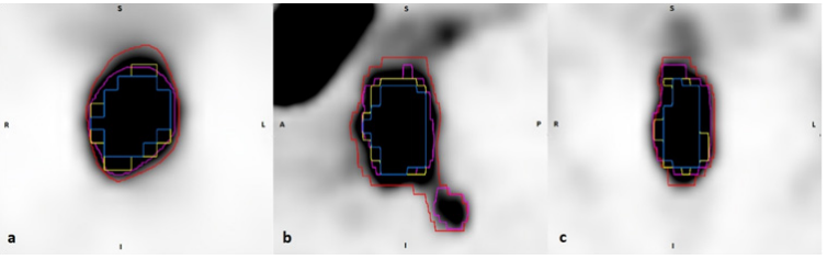 Figure 2 Axial (a), Sagittal (b), and Coronal (c) images demonstrating contour volumes derived from Manual (pink), T40 (red), T50 (yellow), T60 (blue) and SUV-gradient (orange).