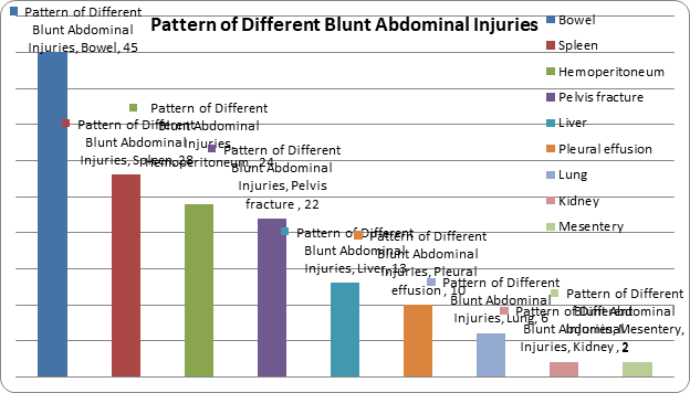 In our study, according to the CT findings, Bowel was the commonest injured organ found in 45 (45.92%) patients followed by spleen in 28 (26.67%) patients, hemoperitoneum in 24 (22.86%) patients, pelvis fracture found in 22 (20.95%) patients, liver found in 13 (12.38%) patients, pleural effusion found in 10 (9.52%) patients, lung found in 6 (5.71%) patients, kidney found in 2 (1.90%) and mesentery injury found in 2 (1.90%) patients. Sah and Sinha reported in their study that 61 cases had blunt abdominal injuries and among them bowel was the most commonly found injured organ in 70.5% patients followed by mesentery in 52.4% patients, spleen in 46% patients, liver in 34.4% and kidney in 11.4% patients.17