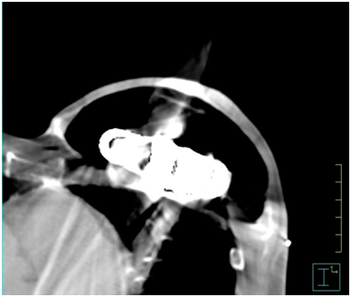 Figure 1 AeroForm™ implant on a transverse slice CT scan. Main components visible are the centrally placed CO2 canister encompassed by a permeable silicone casing.
