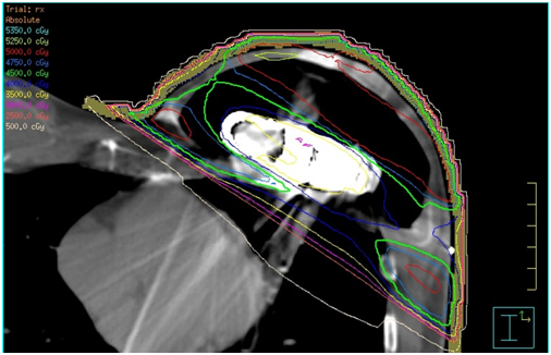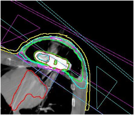 All patients received a standard planning target volume (PTV) prescription of 5000 (cGy) in 25 treatments delivered five times per week. The PTV, as defined by the radiation oncologist on the planning CT scan, included the skin, subcutaneous tissue and pectoral fascia (Figure 2). The planning dosimetry goal was to achieve 95% of the prescribed dose to 95% of the PTV. The following parameters were evaluated on the dose volume histogram (DVH) for assessment of plan quality: PTV receiving 95% and 90% of the prescribed total dose (TD), along with volume (in cubic centimeters) receiving more than 107% of the prescribed TD. The organs at risk (OAR) assessed included: lungs (combined) volume receiving >2000cGy, >1000cGy, >500cGy and mean dose (cGy); left and right lung volumes individually receiving >3000cGy, >2000cGy, >1000cGy, >500cGy and mean dose (cGy); liver volume receiving >3500cGy, and heart volume receiving >2500cGy, >1000cGy and mean dose (cGy). Prescribed OAR for standard breast patients included the heart, liver, left and right lungs. The following additional contours were required due to artifact present on the CT scan: artefact_tissue, artefact_lung, artefact_heart, capsule of the implant and canister (Figure 2).