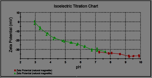 The Zeta potential of the iron oxide samples was analyzed in dispersion in deionized water. The dispersion was treated in an ultrasonic bath for 20 minutes. From the 60g of dispersion prepared, 18 mL were used for each titration, starting at the normal pH of the solution. At each pH 3 measurements were made, each consisting of 20 single measurements. The equipment used was the Zetasizer Nano ZSP from Malvern, the assays were performed at INM.