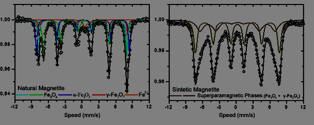 The following oxides were identified in the natural sample: magnetite (Fe3O4) majority phase (64%), maghemite (γ-Fe2O3), hematite (α-Fe2O3) minority phases (12% and 18%, respectively) and traces of other oxides (6%). The technique provides values for the isomeric shift of the phases, relative to αFe, given by δ. In addition, values for the quadrupole unfolding (D) and the hyperfine magnetic field (Bhf) were also obtained.
