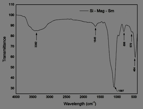 Characterization of silica particles containing iron oxide and samarium: The chemical composition of the samples was obtained by X-ray fluorescence using Shimadzu EDX-720 equipment. The analyses were performed under vacuum. The samples were characterized by X-ray diffraction (XRD), in the Characterization and Microscopy Laboratory of CEFET-MG, using the Shimadzu XRD - 7000 diffractometer operating under the following conditions: CuKα radiation (35 KV/ 40 mA), goniometer speed 0.02° at 2θ per step, with standard counting time per step and collected from 5° to 80° at 2θ. The data were compared with standards contained in the PDF2 database (International Center for Diffraction Data - ICDD, 2003), in the X-Powder Ver. 2004.04.70 software, and supported by examples found in the literature. The thermogravimetry test (TG/DTA) was performed on a Shimadzu DTG – 60H thermal analyzer. The test parameters were: heating rate 10ºC/min, maximum temperature 900°C, inert atmosphere with nitrogen and gas flow of 50ml/min. The chemical composition of the samples was also analyzed by means of Fourier Transform Infrared Spectroscopy (FTIR). For this, Shimadzu equipment was used, model IRPrestige-21 operated in ATR mode in the wavelength range of 4000 cm-1 a 400 cm-1 1 with a resolution of 4 cm-1.