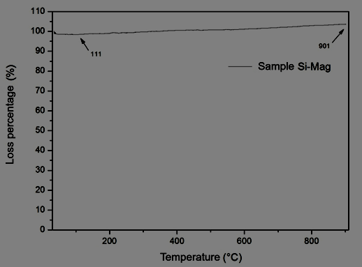 The 11% mass gain in the temperature range between 111°C and 901°C indicates that possibly there was a mineralogical transformation analogous to that described for the Mag sample. However, the FRX analysis indicated that a low amount of silica was produced, unlike than expected by Ferreira.10 The silica was not able to coat the oxide. This behavior needs to be investigated.