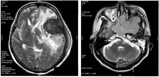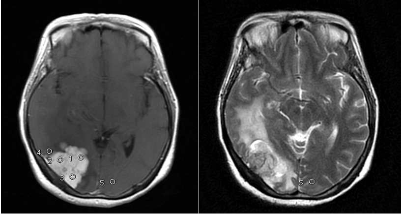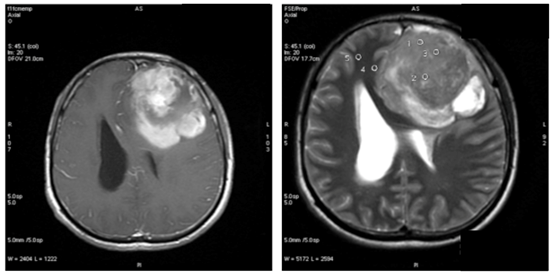 Figure 2 Female, 45 y.o with meningioma at right occipital convexity, tumor vol 26,2 cm3 surround with severe edema turned out as fibroblastic and microcystic type, WHO grade I.
