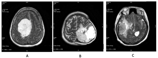 Figure 3 (A) Meningioma at parasagital falx cerebri, fibroblastic type, WHO grade I. (B) Meningioma at left falx cerebri, microcystic type, WHO Grade I. (C) Meningioma at right temporal convexity, turned out to be microcystic type, WHO Grade I.