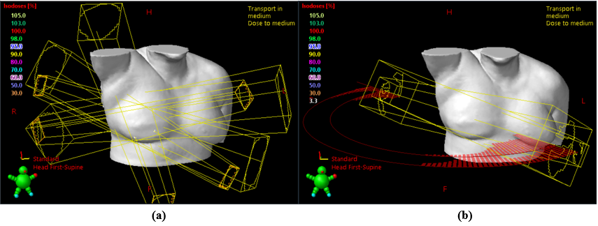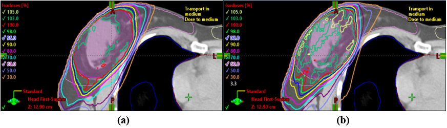 Patients received simulation CT scans (Somatom Sensation; Siemens, Germany) with a slice thickness of 3mm. The slices extended to completely cover the involved breast, lungs, and a 4 cm margin in the cranial and caudal directions. The targets and organ at risks (OARs), such as the normal lungs, heart, normal breasts, and spinal cord were contoured in respective CT slices based on the APBI-IMRT-Florence protocol. The clinical target volume (CTV) was delineated with a uniform 1-cm three-dimensional margin around the surgical clips. The CTV was limited to 3 mm from the skin surface and 3 mm from the lung–chest wall interface. A second uniform, three-dimensional 1-cm margin was added to the CTV to obtain the planning target volume (PTV). The PTV was allowed to extend maximum 4 mm inside the ipsilateral lung and was cropped 3 mm inside the patient’s surface. The ipsilateral and contralateral breast, ipsilateral and contralateral lung, heart, and spinal cord were contoured as OARs. No respiratory control was used. All of patients were planned for APBI treatment on a TrueBeam™ linear accelerator (Varian Medical Systems, Palo Alto, CA, USA) using 6 MV photon beams modulated with a multileaf collimator. Treatment plans were generated using inverse optimization planning, in the Eclipse™ planning system (Version 15.6, Varian Medical Systems, Palo Alto, CA, USA), which is the TPS clinically employed in our center for APBI planning. A dose of 30 Gy in five nonconsecutive, once-daily fractions at 6 Gy/fraction was prescribed.