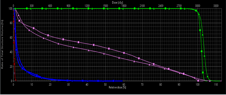 Figure 3 Example of PTV and organ at risk (OAR) dose-volume histogram comparison for IMRT vs. VMAT using flattening-filter (FF) beams. Displayed lines are as follows, green : PTV; pink : Ipsilateral normal breast: blue: ipsilateral lung ; dark red: heart; ▲: VMAT; ■: IMRT.