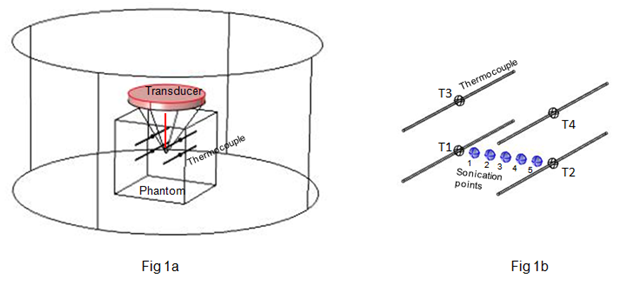 Positioning the HIFU beam at the desired location is a challenge due to the extremely small diameter of the ellipsoid shaped beam (around a couple of mm). A manual iterative positioning procedure was used in locating the beam on the selected locations. Initially the beam was approximately placed at T1, knowing the focal length of the transducer. Low power level sonications were performed around T1 at several locations at incremental distances from one another and temperature rise was recorded at each location. The sonicating point showing the maximum temperature rise at T1 was considered as location of the junction of thermocouple T1 and the positional coordinates (in three dimensions, x1, y1, z1) were recorded. Similarly, position of T2 was found and its coordinates recorded (x2, y2, z2). Knowing the coordinates of T1 and T2, the distance between T1 and T2 was divided into 6 equal intervals. Hence, the 5 sonicating points (1, 2, 3, 4, and 5), indicated in Figure 1b, were determined.
