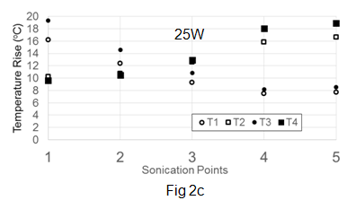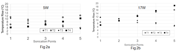 From the above we may conclude that there is a definite effect of power level on the transducer focal distance. As power level increases from 5W to 17W, the beam moves up from the plane of T1-T2 to a plane approximately midway between the planes of T1-T2 and T3-T4. This is evident from the temperatures measured by T1 and T3 being similar at most of the sonicating points (Figure 2b). Also temperatures measured by T2 and T4 are similar at most points at power level 17W. At the highest power level of 25W, temperature recorded by T3 is higher than that recorded by T1 and the temperature recorded by T4 is higher than that recorded by T2, at most points. This suggests that the beam has further moved up to a plane very close to the plane containing T3 and T4. Besides change in focal length, the possibility of the beam changing shape from ellipsoid to conical cannot be ruled out. This is explained further in the following paragraph discussing the results in the light of previous studies.