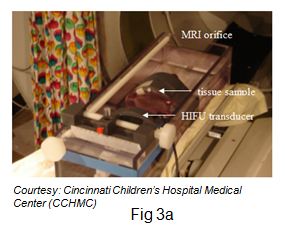 A challenge encountered by HIFU researchers is development of an investigation technique to reliably characterize the thermal effect of HIFU transducer operating parameters in a real tissue sample or a tissue mimicking phantom. As recently as 2014, Solovchuk et al.1 performed HIFU studies on porcine muscle using MRI measurements together with numerical simulations. There was an acceptable agreement, especially at lower power levels, between MRI temperature measurements and simulations which accounted for non-linearity. Also, lesion shapes within the tissue sample were examined by physically slicing the sample revealing distortion of shape and size at higher powers. In investigations performed by the present authors at an earlier date,2 MRI thermometry and imaging was performed to measure HIFU induced temperature rise in porcine liver samples and to measure lesion size at selected sonication times. A low pass filter was incorporated to overcome the effect of extraneous noise, affecting the scanning process. Comparing with numerical simulations it was found that temperature was measured with an 88% accuracy, similar to the accuracy levels achieved by Solovchuk et al.1 The present authors in their previous studies2 also found considerable distortion of lesion shape and size at higher power levels revealed by visual examination of lesions in sliced liver samples and MRI imaging.