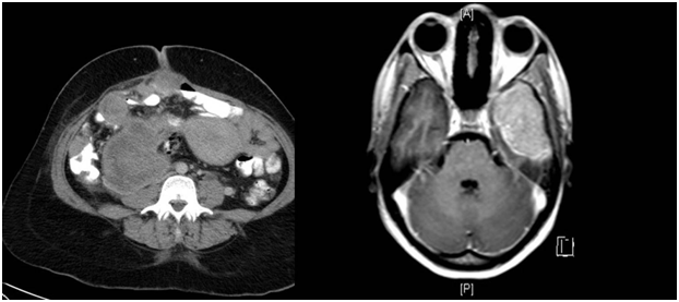 Figure 2 Contrast enhanced T1 weighted images, MRI of the brain showing an intensely enhancing mass in the left middle cranial fossa.