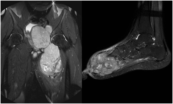 Figure 5 STIR coronal sequences of the pelvis, MRI images showing a heterogeneously hyperintense mass in the pelvis arising from the acetabulum.