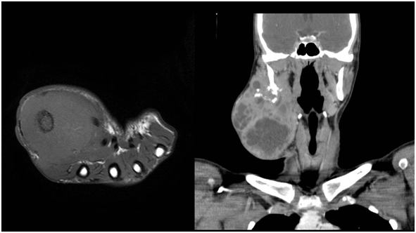 Figure 8 Contrast enhanced, CT coronal sections showing a heterogeneous mass arising from the right mandible.