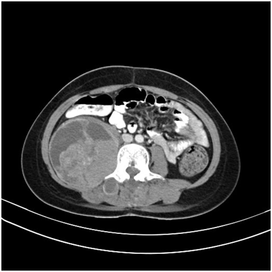 Figure 9 Contrast enhanced axial CT sections of abdomen showing a heterogeneous mass in the right para-spinal region.