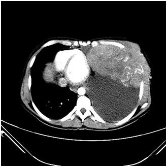 Figure 3 Contrast enhanced CT axial sections of the abdomen showing a large heterogeneous mass arising from the pancreatic tail.