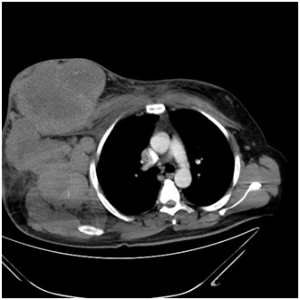 For the 50 patients evaluated, data was obtained from 26 CT scans and 30 MRI scans that were performed on these patients. Demographic distribution included 40 men and 10 women; age range was from19 to 40years. The mean age of the patients at the time of diagnosis was 23.2years. The location of the tumours was predominantly in the chest wall, limbs and extra skeletal sites, as shown in Table 1. 9 patients had extraskeletal tumours. The mean diameter of the primary tumour was 8.2cm (range: 8 to 20cm). The tumour margin was well preserved (i.e. smooth or lobular) in 34 patients. Central fluid attenuation was present in 20 tumours, and calcification in eight patients. One patient had skip lesions, 2 patients had hemorrhagic lesions. Almost all lesions were of low signal on T1 images and high signal on T2 images. Metastasis was present in eight patients at presentation. Among all patients, 16 showed evidence of adjacent organ invasion, and 4 showed adjacent neuro vascular invasion. Some rare interesting sites such as ovary, prostate, rectum, scrotum, brain and pancreatic tail were encountered (Figures 1‒4). The other sites were the soft tissues in the region of the chest wall, axilla and infraclavicular fossa (Figures 5‒10). One patient had a large chest wall mass with large axillary nodes, a very atypical finding (Figures 11).