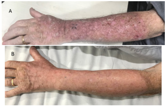 This study has provided key learnings and suggests that further research is warranted. It seems that if the dose used in our national protocol is totally delivered there is sufficient in-field control of fields of in-situ disease from keratinocytic lineage regardless of treatment breaks. Completing the prescribed course is important. Anything that can be done to assist this, including more breaks, should be done. Identifying those at risk of lymphoedema is the subject of a study being undertaken by Dr Chelsie O’Connor and the Australian Lymphoedema Education, Research and Treatment team at Macquarie University Hospital.30