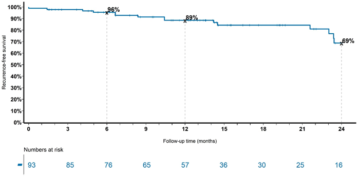 Figure 2 Recurrence over time for the whole cohort with keratinocytic lineage treated with radical intent. Note in-field control of 89% at 12 months.