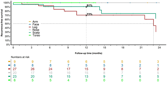 Figure 3 Recurrence over time for the whole cohort with keratinocytic lineage treated with radical intent divided into anatomical locations of scalp, face, nose, torso, arms and legs.