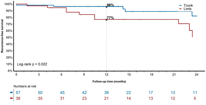 Figure 4 Recurrence over time for the whole cohort with keratinocytic lineage treated with radical intent divided into either trunk (scalp, face, nose, torso) or limbs (arms, legs).