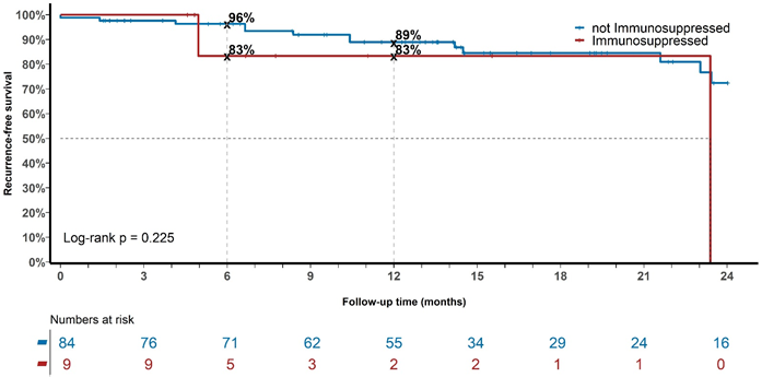 Figure 5 Recurrence over time for the whole cohort with keratinocytic lineage treated with radical intent divided into either immunosuppressed versus non-immunosuppressed.