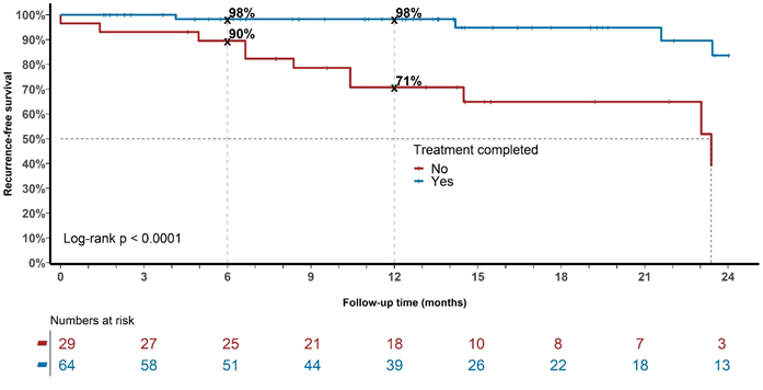 Figure 6 Recurrence over time for the whole cohort with keratinocytic lineage treated with radical intent divided into those who completed treatment versus those who did not. Note in-field control at 6 and 12 months of 98% for those who completed the prescribed treatment versus 90% and 71% respectively for those who did not (Log-rank p <.0001).