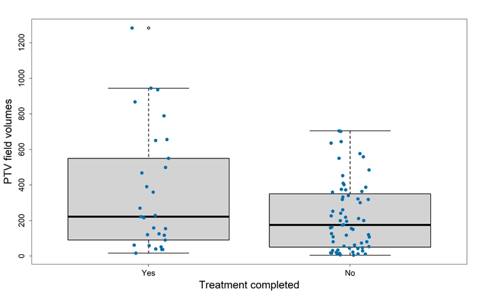 Figure 7 PTV size and completion of treatment. There was no significant difference between those who had a PTV over the median (175cm3) versus those who had a PTV under the median.