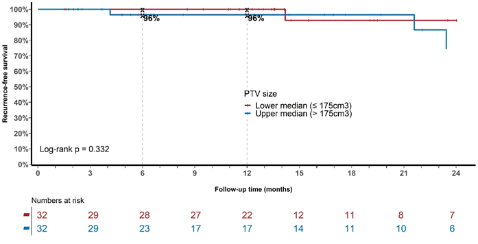 Figure 8 Recurrence PTV size and recurrence. There was no significant difference between fields with a PTV over the median versus fields with a PTV under the median size.