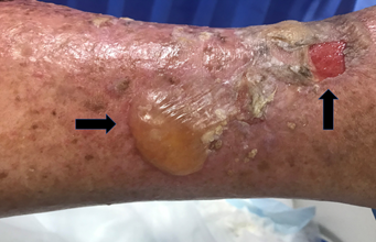 Figure 12 Significant painful blistering medial left ankle at the end of a two-week break following 18Gy in 10 fractions. Horizontal arrow shows an unpopped blister. Vertical arrow shows a popped blister. This phenomenon was presumably due to lymphoedema.