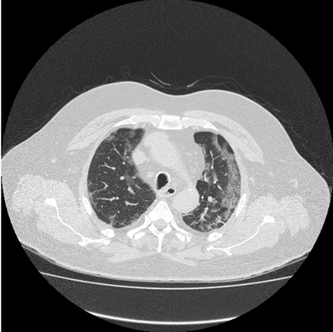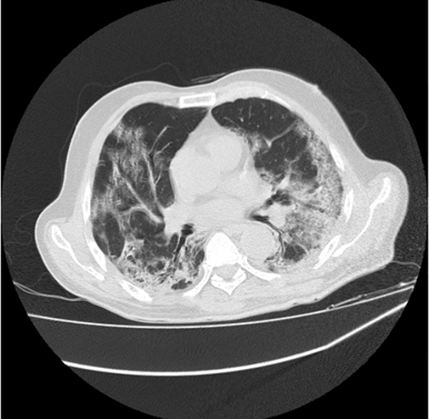 The image reflects the Covid pulmonary consolidation which tends to be patchy or segmental and nodular. It reflects the sensitive stage of the patient, especially when around 10-12 days have passed. Initially, the appearance of GGO reflects early stage of COVID, but as it develops, it continues increasing pulmonary consolidation and air bronchogram in lungs. (Figure 3)