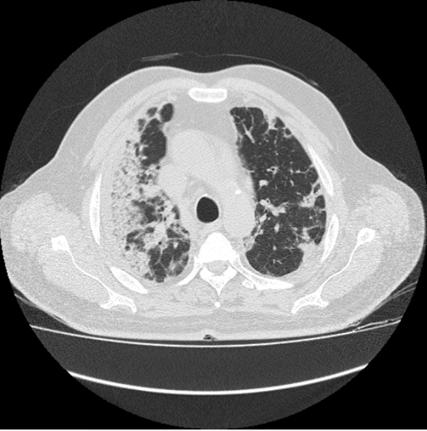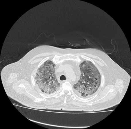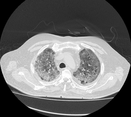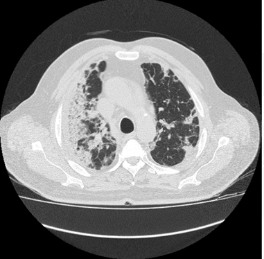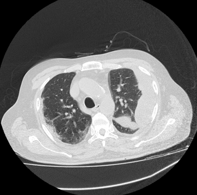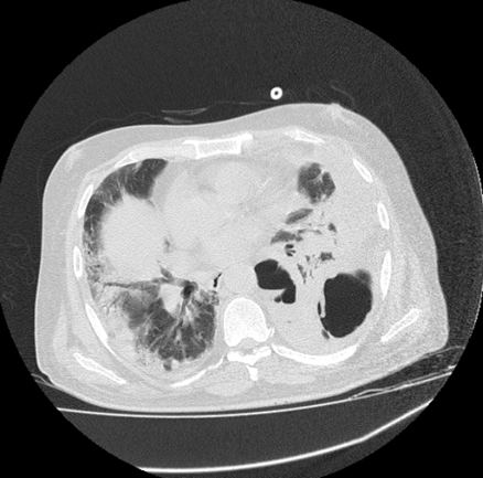 This image also reflects the crazy paving sign, which is showing rapid and high rise in disease progression. The crazy paving sign represent the increasing thickness of GGO, along with air bronchogram which makes it difficult for the patient to breath smoothly. Left also shows few cavitatory lesions. (Figure 7)