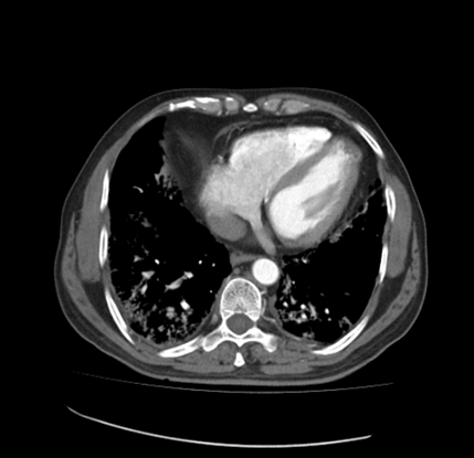 The above image also reflects the presence of ground-glass opacity along with air bronchogram which increases difficulty of breathing to the patient. This stage reflects the presence of pulmonary consolidation in patient’s lungs, which may proceed if immediate treatment is not provided to the patient. The increase in this consolidation means difficulty in breathing, which also show some symptoms like fever, fatigue, and severe cough. (Figure 4)