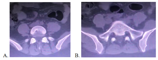 Computed tomography: Significant bone destruction of posterior elements of S1 and S2 (Figure 1).