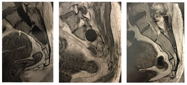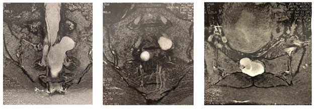 Magnetic Resonance Imaging (MRI) showed a perineural cyst extending from S2 to S4, remodeling posterior walls of S2 and S4 and enlarging sacral foramina of S2 to the right and S3 to the left, occupying almost entire vertebral canal (Figure 2).