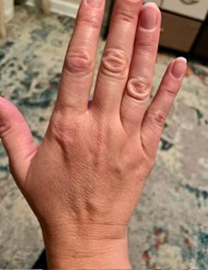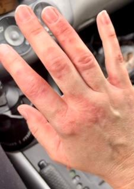Figure 1 Dorsal surface of the patient's right hand prior to the initiation of Freeze-Dried Bravo probiotic consumption. Characteristic signs of contact dermatitis, including erythema (redness) and edema (swelling) can be observed.