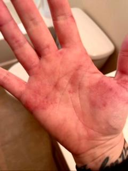 Figure 2 Palmar surface of the patient's right hand prior to the initiation of Freeze-Dried Bravo probiotic consumption. Characteristic signs of contact dermatitis, including erythema (redness) and edema (swelling) can be observed.