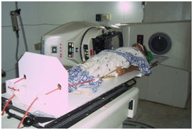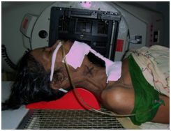 As Orfit cast is not being used for the patient, a simple type of POP immobilization is prepared by having a POP strip at the chin and another at shoulder level. The patient positioned with this immobilizer in cobalt machine is shown in Figure 5. The patient with shoulder retractor in position along with mounted Al Compensator on the treatment head of cobalt machine is shown in Figure 6.