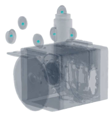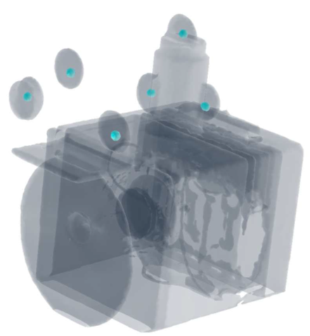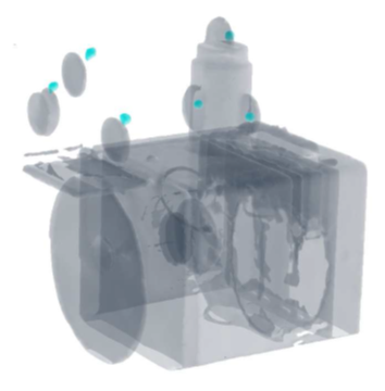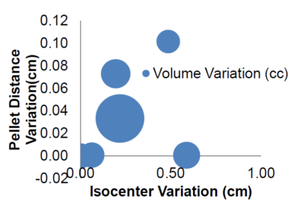 The exams were reviewed and sorted into 10 phases retrospectively. The 0% phase image set, 50% phase image set, maximum intensity projection (MIP) image set, and average intensity projection (Ave-IP) image set were exported to the Eclipse treatment planning system for analysis. Figure 2a-2e shows the volume of motion pellets at different image sets at 350HU window width and 40HU window level. And then, in image sets, multidimensional variables such as center coordinate of pellets, distance between pellets, and volume of the pellets. Figure 1 displays the Phantom and Pellets for this study.