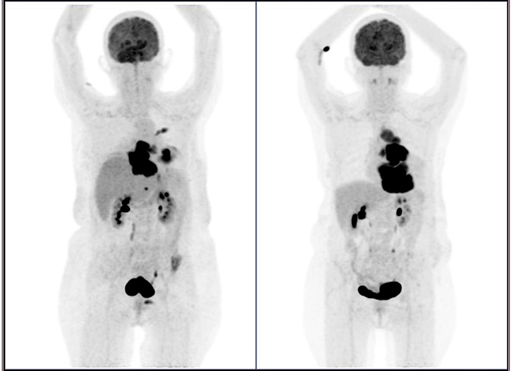 Figure 1 Maximal intensity projection (MIP) images from [18F]FDG PET/CT scans illustrating the end-of-treatment (left) and baseline (right) scans of an 83-year-old woman with recurrent lymphoma undergoing chemotherapy. The end-of-treatment scan, conducted after four cycles of chemotherapy for recurrent lymphoma, revealed a new hypermetabolic upper abdominal node and persistent supradiaphragmatic nodal masses, indicative of disease progression. Additionally, an incidental finding of new left crossed cerebellar diaschisis was observed, reflecting new brain pathology.