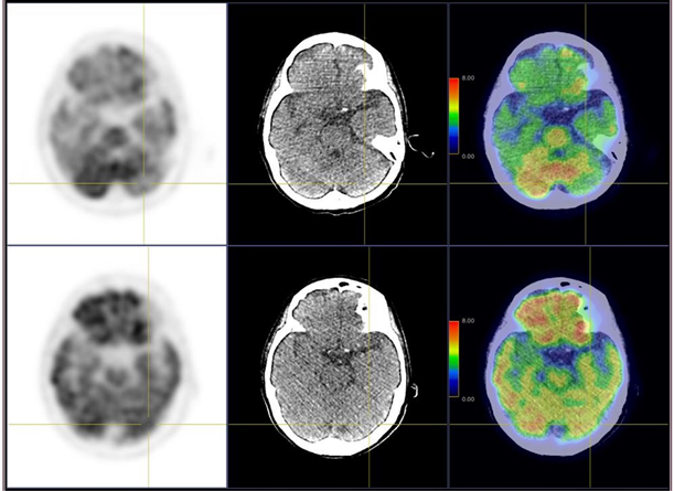 Figure 2 Comparison of transaxial PET, CT, and fusion images from the end-of-treatment scan (upper row) and baseline scan (bottom row). The images depict reduced left cerebellar activity in the new scan.