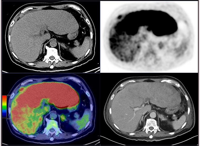 Figure 5 Transaxial CT, PET and fusion images from the [18F]FDG PET/CT scan and a contrast CT performed nine days later. An incidental marked patchy activity in the left liver lobe on PET, along with slight hypodense changes and enlargement on plain CT, was observed. The subsequent contrast CT confirmed a filling defect in the left portal vein, indicative of portal venous thrombosis.