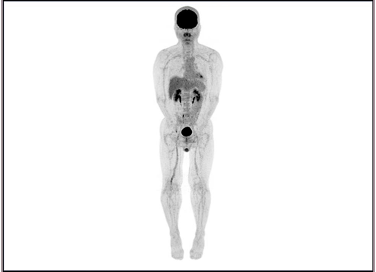 Figure 6 MIP image from the staging [18F]FDG PET/CT scan of a 40-year-old man with fever of unknown origin. The scan exhibited hypermetabolic consolidation in the left lower lung lobe, along with asymmetrical activity in the right femoral vein and right popliteal vein.