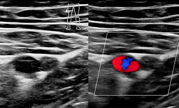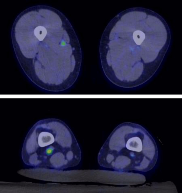 A 40-year-old man presented with a prolonged fever of unknown origin, prompting a [18F]FDG PET/CT scan to investigate potential sources of infection or inflammation. The imaging revealed hypermetabolic consolidation in the left lower lung, alongside incidental asymmetrical activity in the right femoral vein and right popliteal vein (Figure 6 and 7). Doppler ultrasonography images of the right lower limb showing non-compressibility in the right femoral and right popliteal veins, along with the presence of echogenic thrombi, confirming a diagnosis of deep venous thrombosis (Figure 8). Patient remains well after anti-coagulation therapy.
