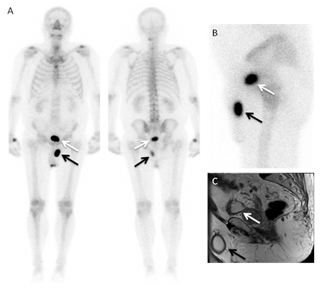 Figure 1 A. Bone scan planar, anterior and posterior, whole body images after intravenous injection of 925 Mbq of 99mTc-HMDP, performed according to the standard protocol, show an accumulation of the radiotracer in the left anterior extra-pelvic region (black arrows), with a similar intensity to that of the bladder (white arrows),