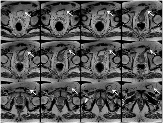 Figure 2 Some T2W-Pelvic MRI transversal slices showing the inclusion of the supero-lateral region of the urinary bladder (white arrows) in the left inguinal hernia.