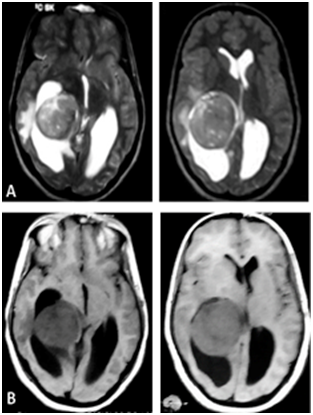 Figure 1 Axial (A) T2-weighted and (B) T1-weighted MRIs showing a right lateral intraventricular meningioma.Notice the regular aspect of the lesion.