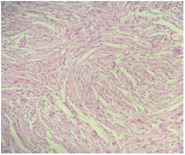 A 17years old female, presented with increasing intracranial pressure syndrome, severe headache, vomiting, and papillary oedema grade1. The patient was without any sensory or motor deficit. The CT and MRI shows a huge intraventricular lesion located in the occipital Horne of the right lateral ventricle (Figure 1). The patient underwent a ventricular shunting, and the tumor was excised in a second time. The removal was complete using a temporo parietal approach, and the post operative status was stable, with improvement of the headache. The histological exam indicates a fibroblastic meningioma (Figure 2).