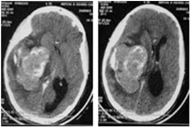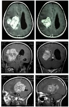 A 15years old girl, consulting for severe headache, with vomiting, and diplopia. The physical examination shows no motor or sensory deficit, and right 6th nerve pulsy, with papillary oedema grade 2. CT and MRI show a very large intraventricular tumor, located at the right lateral ventricle (Figure 3) (Figure 4). The patient underwent ventricular shunting, and the tumor was removed in a second time. The excision was total using a temporo parietal approach, and the post operative status was simple, with improvement of the headache. The histological exam indicates a fibroblastic meningioma too.