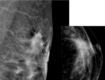 Therefore, the description of the mass spatial on mammography has at least two meanings. First, this is a predictor for the luminal subtype A. Secondly; it is a final stage appearance as a result of adipose tissue invasion by carcinoma tissue.7